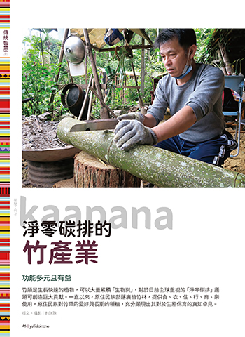 傳統智慧王 鄒語:竹子 kaapana 淨零碳排的 竹產業 功能多元且有益 竹類是生長快速的植物,可以大量累積「生物炭」,對於目前全球重視的「淨零碳排」議 題可創造巨大貢獻。一直以來,原住民族部落廣植竹林,提供食、衣、住、行、育、樂 使用,原住民族對竹類的愛好與長期的種植,充分顯現出其對於生態保育的真知卓見。 撰文、攝影|林瑞珠 46 | yu'fafoinana ɨʹ @ෂ୕౽ᅆˮ JOEE ɨʹ @ෂ୕౽ᅆˮ JOEE