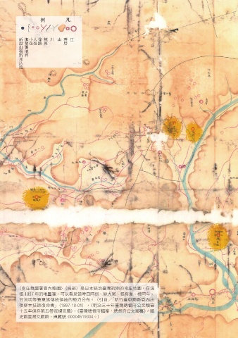 新設出張所見込地 撫墾署境界 小灶 大灶 條路 境界 川 山 蕃厝 庄 〈南庄撫墾署管內略圖〉(局部)是日本統治臺灣初期的南庄地圖。在這 張 1897 年的地圖裡,可以看見當時日阿拐、絲大尾、張有淮、樟阿斗、 豆流明等賽夏族傳統領袖的勢力分布。(引自/「新竹臺中兩縣管內出 張柳本技師復命書」(1897-10-01),〈明治三十年臺灣總督府公文類纂 十五年保存第五卷官規官職〉,《臺灣總督府檔案.總督府公文類纂》,國 史館臺灣文獻館,典藏號 :00004519004。)