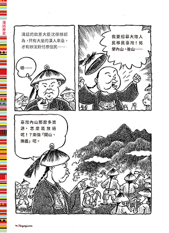 漫話歷史 清廷的欽差大臣沈葆楨認 我要招募大陸人 為,只有大量的漢人來臺, 民 移民臺 灣! 拓 才有辦法對付原住民…… 墾內山、後山…… 嗯…… 臺灣內山那麼多資 源,怎麼能放過 呢!?來個「開山、 撫番」吧。 14 | bangangesaran ɨʹ @ဘ༑ዝ̦ JOEE ɨʹ @ဘ༑ዝ̦ JOEE