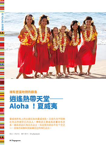 原 世界觀 YOUNG ❶ 擁有豐富地貌的群島 逍遙熱帶天堂── Aloha !夏威夷 夏威夷群島上的主要民族為夏威夷族,其祖先為早期移 居至此的玻里尼西亞人,傳統語言夏威夷語屬南島語 系,雖和英語同為官方語言,母語使用者卻不到千分之 一,是聯合國教科文組織認定的瀕危語言。 撰文|蔡舒湉 圖片提供| Shutterstock 38 | bangangesaran ɨʹ @ࡡZPVOH˰ޢᝈ JOEE ɨʹ @ࡡZPVOH˰ޢᝈ JOEE