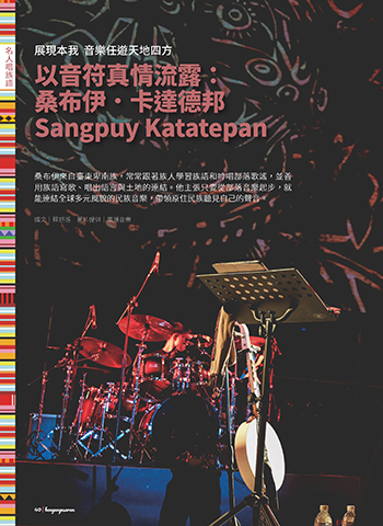 名人唱族語 展現本我 音樂任遊天地四方 以音符真情流露: 桑布伊.卡達德邦 Sangpuy Katatepan 桑布伊來自臺東卑南族,常常跟著族人學習族語和吟唱部落歌謠,並善 用族語寫歌、唱出語言與土地的連結。他主張只要從部落音樂起步,就 能連結全球多元風貌的民族音樂,帶領原住民族聽見自己的聲音。 撰文|蔡舒湉 圖片提供|風潮音樂 40 | bangangesaran ɨʹ @ΤɛਨૄႧ JOEE ɨʹ @ΤɛਨૄႧ JOEE