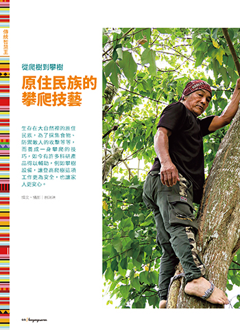 傳統智慧王 從爬樹到攀樹 原住民族的 攀爬技藝 生存在大自然裡的原住 民族,為了採集食物、 防禦敵人的攻擊等等, 而養成一身攀爬的技 巧,如今有許多科研產 品得以輔助,例如攀樹 設備,讓登高爬樹這項 工作更為安全,也讓家 人更安心。 撰文、攝影|林瑞珠 44 | bangangesaran ɨʹ @ෂ୕౽ᅆˮ JOEE ɨʹ @ෂ୕౽ᅆˮ JOEE