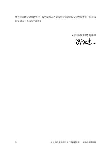 林世界共織希望的總整理。我們期盼近人遠族都來強大原民文化學術體質,有想寫 寫塗塗者,寄來共享就對了。 《原住民族文獻》總編輯 (11) 山林健朗 痛解康泰 近人遠族都健康──總編輯全輯的話