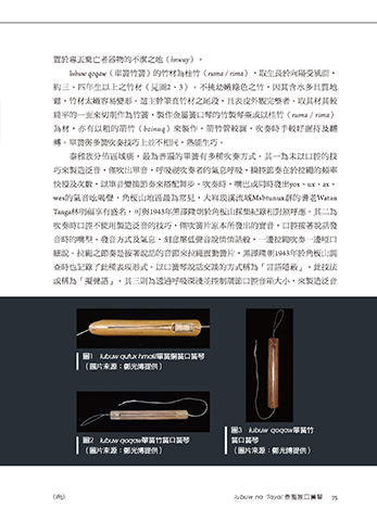 為材,亦有以粗的箭竹(bzinuq)來製作,箭竹管較圓,吹奏時手較好握持及翻