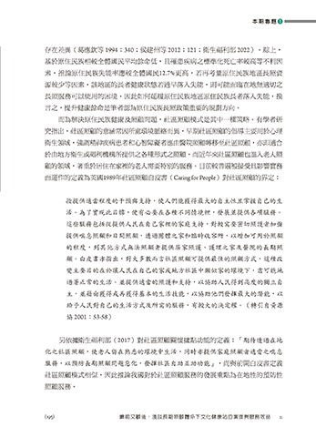 而為解決原住民族健康及照顧問題,社區照顧模式是其中一種策略。有學者研