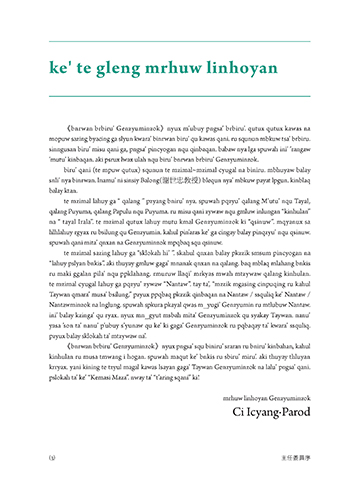 snli’ nya binrwan. lnamu’ ni sinsiy Balong(謝世忠教授) blequn nya’ mbkuw payat lpgun. kinblaq