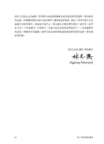 寫作可以使人心思細密,對學術生涯或各種職場生涯的成長與才能發揮,都有極大 的助益。有興趣於寫作的原住民新秀們,應該要勇於嚐試。對此,筆者有個小小的 建議可以提供參考。那就是不要自己一個人獨自品嚐苦澀的咖啡,要分享,要不 恥上問、下問或橫問。在過程中,其實可以向其他師長學友招手,一同閱讀審查 的意見,聆聽多方的建議,對於完成文章和開拓更多更寬廣的寫作之路,會有絕 妙的好處。 《原住民族文獻》學術顧問 (Agilasay Pakawyan) (5) 序|不恥多問好處多