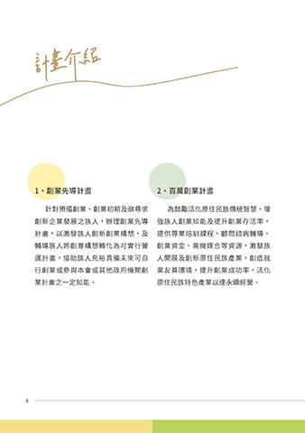 1、創業先導計畫 2、百萬創業計畫 針對預備創業、創業初期及欲尋求 為鼓勵活化原住民族傳統智慧、增 創新企業發展之族人,辦理創業先導 強族人創業知能及提升創業存活率, 計畫,以激發族人創新創業構想,及 提供專業培訓課程、顧問諮詢輔導、 輔導族人將創意構想轉化為可實行營 創業資金、商機媒合等資源,激發族 運計畫,協助族人充裕具備未來可自 人開展及創新原住民族產業,創造就 行創業或參與本會或其他政府機關創 業友善環境,提升創業成功率,活化 業計畫之一定知能。 原住民族特色產業以達永續經營。 8