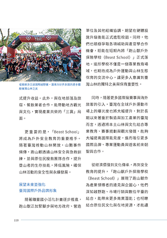 宿、餐飲業者合作,能帶動地方觀光 旅客的引入,臺灣在全球戶外運動市