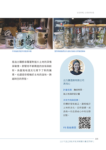 在地原鄉心 企業創新創業 不同瓶款因應不同需求市場 堅持傳統釀酒文化並致力推廣自然釀造風味 瓶出力釀都承載著對這片土地的深情 與敬意。那堅持不斷精進的技術與創 新,為臺灣地酒文化寫下了新的篇 章,也讓這份根植於土地的滋味,跨 越時空的界限。 出力釀酒業有限公司 高悅心 計畫名稱|釀者修業— 風土地酒研發計畫 未來方向與目標| 持續研發新產品,讓根植於 土地的文化,自然發酵,成 為每一位品酒者心中的甘醇 記憶。 FB 粉絲專頁 115 113 年度企業創新創業輔導計畫成果專刊