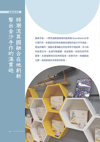 輔導創新研發 擊出金沙手作的滿貫砲 將潮流異國融合在地創新 臺東市區,一間充滿異國風情的曼貫砲 GrandslameS 伴 手禮門市,有著來自於新加坡潮流風味的金沙手作食品, 是由方耀昀.達曼夫妻倆創立的在地伴手禮品牌。自 106 年創業至今,走過市集擺攤、食品展售,再到自有門市 運營,夫妻倆堅持全程烘烤製成、新鮮手作,持續創造 口碑,成為臺東伴手禮界的新星。 116