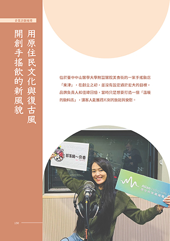 企業診斷輔導 開創手搖飲的新風貌 用原住民文化與復古風 位於臺中中山醫學大學附設醫院美食街的一家手搖飲店 「來津」,在創立之初,並沒有設定過於宏大的目標, 品牌負責人松佳瑋回憶,當時只是想要打造一個「溫暖 的飲料店」,讓客人能獲得片刻的放鬆與安慰。 150
