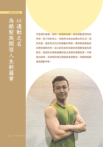 創業先導計畫 為銀髮族開啓人生新篇章 以運動之名 李家睿的故事,始於一條回家的路。身為運動管理專長 的他,為了陪伴家人,他毅然決定結束臺北的生活,回 到花蓮,重新思考自己與運動的關係。偶然教授銀髮族 的樂齡課程的他,深入研究其內容安排與運動強度的適 配性,發現許多樂齡機構則缺乏專業的運動指導,市場 潛力無窮,未來期許建立銀髮健身俱樂部,持續開拓銀 髮族運動市場。 16