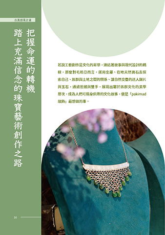 百萬創業計畫 創業先導計畫 踏上充滿信念的珠寶藝術創作之路 把握命運的轉機 若說工藝創作是文化的昇華,連結著故事與現代設計的橋 樑,那麼對毛皓亞而言,運用金屬、在地天然寶石去探 索自己、族群與土地之間的關係、讓自然交疊的迷人銀片 與玉石,通過思緒與雙手,展現出屬於族群文化的美學 層次,成為人們可隨身佩帶的文化故事,便是「pakimad 故飾」最想做的事。 30 30