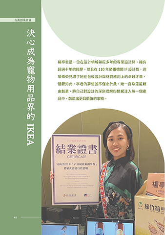 百萬創業計畫 創業先導計畫 決心成為寵物用品界的 楊亭君是一位在設計領域耕耘多年的專業設計師,擁有 超過十年的經歷,並且在 110 年榮獲德國 IF 設計獎,這 項殊榮見證了她在包裝設計與材質應用上的卓越才華, 儘管如此,亭君的夢想並不僅止於此,她一直希望能藉 由創業,將自己對設計的深刻理解與情感注入每一個產 品中,創造出更具價值的事物。 IKEA 46 46
