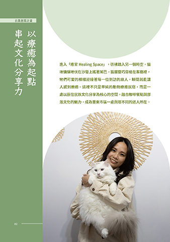 百萬創業計畫 創業先導計畫 串起文化分享力 以療癒為起點 進入「癒室 Healing Space」,彷彿踏入另一個時空,貓 咪慵懶地伏在沙發上搖著尾巴,狐獴靈巧穿梭在客廳裡, 牠們可愛的模樣迎接著每一位到訪的旅人,瞬間就能讓 人感到療癒。這裡不只是單純的動物療癒民宿,而是一 處以原住民族文化分享為核心的空間,融合咖啡餐點與部 落文化的魅力,成為臺東市區一處與眾不同的迷人所在。 82 82
