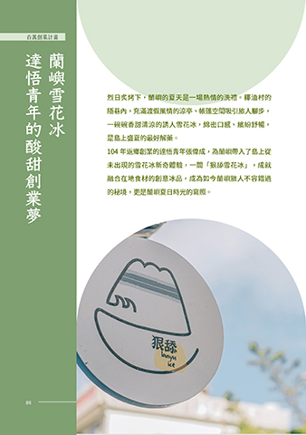 百萬創業計畫 創業先導計畫 達悟青年的酸甜創業夢 蘭嶼雪花冰 烈日炙烤下,蘭嶼的夏天是一場熱情的洗禮。椰油村的 隱巷內,充滿渡假風情的涼亭、帳篷空間吸引旅人腳步, 一碗碗香甜清涼的誘人雪花冰,綿密口感、繽紛舒暢, 是島上盛夏的最好解藥。 104 年返鄉創業的達悟青年張偉成,為蘭嶼帶入了島上從 未出現的雪花冰新奇體驗,一間「狠舔雪花冰」,成就 融合在地食材的創意冰品,成為如今蘭嶼旅人不容錯過 的秘境,更是蘭嶼夏日時光的寫照。 86 86