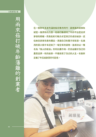百萬創業計畫 創業先導計畫 用雨來菇打破年齡藩籬的創業者 在一個對年長者充滿刻板印象的時代,蔣順風的故事無 疑是一股清新的力量。他用行動證明了年齡不該是追求 夢想的障礙,而勇氣和行動力才是真正的成功秘訣,這 位來自屏東恆春的農民,憑藉自己的雙手和智慧,在歲 月的第六個十年迎來了一場全新的冒險,並成功以一種 名為「情人的眼淚」的特別農作物,打造出屬於自己的 農業品牌,他的故事,不僅改寫了自己的人生,也重新 定義了年長者創業的可能性。 90 90