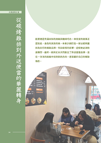 百萬創業計畫 創業先導計畫 從 碳烤雞 排到外送便當的華麗轉身 創業總是充滿未知的挑戰與機緣巧合,林佳旻的故事正 是如此,身為阿美族的她,本來計劃打造一家以碳烤雞 排為主打的餐飲品牌,但因疫情的影響,迫使她必須快 速轉型,最終,她與丈夫共同創立了外送便當品牌,並 在一次次的挑戰中找到新的方向,書寫屬於自己的餐飲 傳奇。 94 94