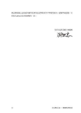 務必積極關心這份國內難得見著的原民學術併合半學術的期刊,趕緊準備投稿,立 即加入成為文化尋覓團隊的一員。 《原住民族文獻》總編輯 (11) 文化尋覓之途──總編輯全輯的話