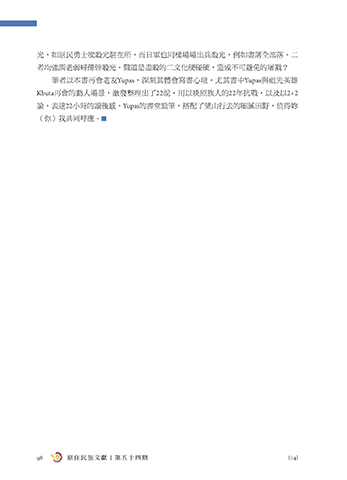 光,如原民勇士欲殺光駐在所,而日軍也同樣場場出兵殺光,例如盡屠全部落。二 者均強調老弱婦孺皆殺光。難道是盡殺的二文化硬碰硬,造成不可避免的屠戮? 筆者以本書再會老友Yupas,深刻其體會寫書心境,尤其書中Yupas與祖先英雄 Kbuta再會的動人場景,激發整理出了22說,用以映照族人的22年抗戰,以及以2+2 論,表達22小時的讀後感。Yupas的書堂勁筆,搭配了望山行去的細膩田野,值得妳 (你)我共同呼應。 98 原 住 民 族 文 獻 | 第 五 十 四 期 (114)