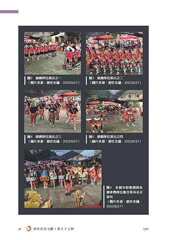 圖2 競賽隊伍演出之一 圖3 競賽隊伍演出之二 (圖片來源:謝世忠攝,2023/8/27) (圖片來源:謝世忠攝,2023/8/27) 圖4 競賽隊伍演出之三 圖5 競賽隊伍演出之四 (圖片來源:謝世忠攝,2023/8/27) (圖片來源:謝世忠攝,2023/8/27) 圖6 各個年齡階層與各 個參賽隊伍集合等待名次 宣布 (圖片來源:謝世忠攝, 2023/8/27) 58 原 住 民 族 文 獻 | 第 五 十 七 期 (356)