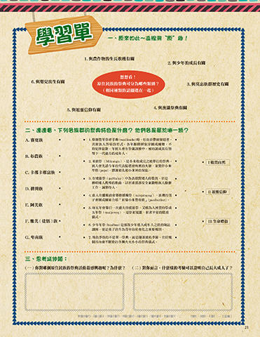 ( 一 ) 你對哪個原住民族的祭典活動最感興趣呢?為什麼? ( 二 ) 對你而言,什麼樣的考驗可以證明自己長大成人了?