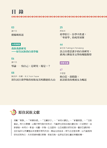 掌故」等六大專欄,以電子期刊發行的形式,刊載原住民族各種文獻史料、口述歷史、田