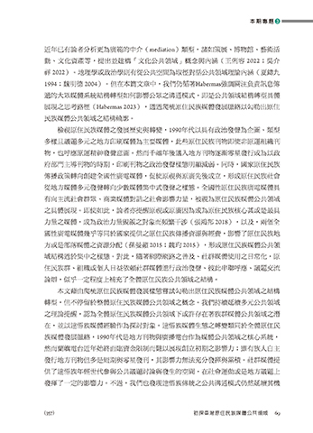 動、文化資產等,提出並建構「文化公共領域」概念與內涵(王俐容 2022;吳介
