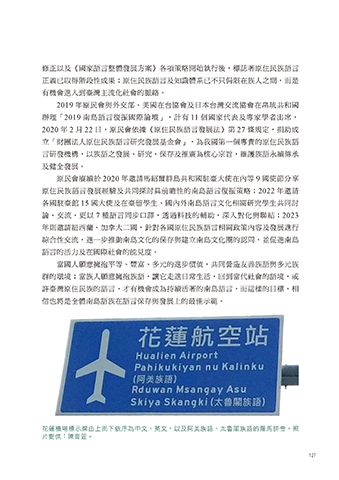 花蓮機場標示牌由上而下依序為中文、英文,以及阿美族語、太魯閣族語的羅馬拼音。照
