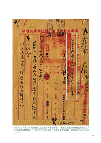 1945 年 12 月頒訂的《臺灣省人民回復原有姓名辦法》,改變了原住民族傳統的命名文化。 《行政長官公署檔案》(1945 年 12 月 8 日),國史館臺灣文獻館,典藏號 0031440000 7001。 131
