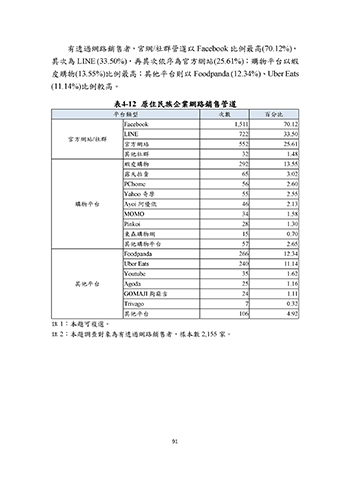 有透過網路銷售者,官網/社群管道以 Facebook 比例最高(70.12%),