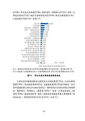 (34.38),其次為人力短缺(17.96)、競爭激烈、利潤縮小(17.53)、進貨、人