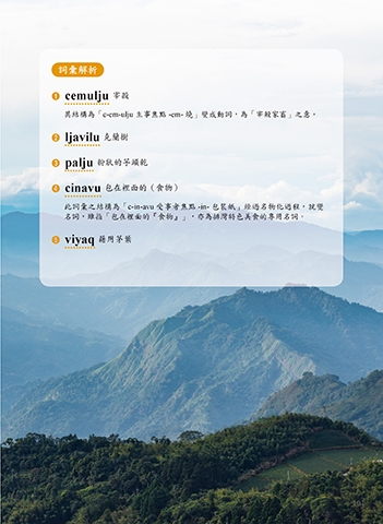 詞彙解析 1 cemulju 宰殺 其結構為「c-em-ulju 主事焦點 -em- 燒」變成動詞,為「宰殺家畜」之意。 2 ljavilu 克蘭樹 3 palju 粉狀的芋頭乾 4 cinavu 包在裡面的(食物) 此詞彙之結構為「c-in-avu 受事者焦點 -in- 包裝紙」經過名物化過程,就變 名詞,雖指「包在裡面的『食物』」,亦為排灣特色美食的專用名詞。 5 viyaq 藉用茅葉 101