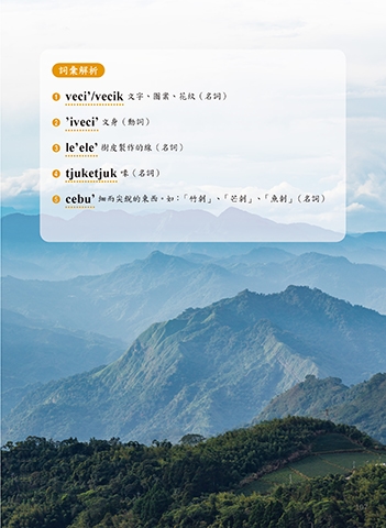 詞彙解析 1 veci’/vecik 文字、圖案、花紋(名詞) 2 ’iveci’ 文身(動詞) 3 le’ele’ 樹皮製作的線(名詞) 4 tjuketjuk 喙(名詞) 5 cebu’ 細而尖銳的東西。如:「竹刺」、「芒刺」、「魚刺」(名詞) 107