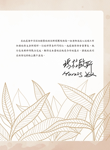 在此感謝辛苦採訪錄製的族語新聞團隊與每一位老師及投入這項工作 任務的原文會新聞部、行政部等各部門同仁,也感謝原語會董事長、執 行長及夥伴們戮力完成,期待這本書的出版是合作的基石,讓彼此共同 在族語這條路上攜手並進。