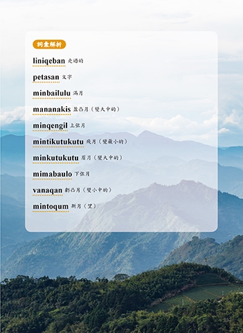 詞彙解析 liniqeban 走過的 petasan 文字 minbailulu 滿月 mananakis 盈凸月(變大中的) minqengil 上弦月 mintikutukutu 殘月(變最小的) minkutukutu 眉月(變大中的) mimabaulo 下弦月 vanaqan 虧凸月(變小中的) mintoqum 新月(望) 133
