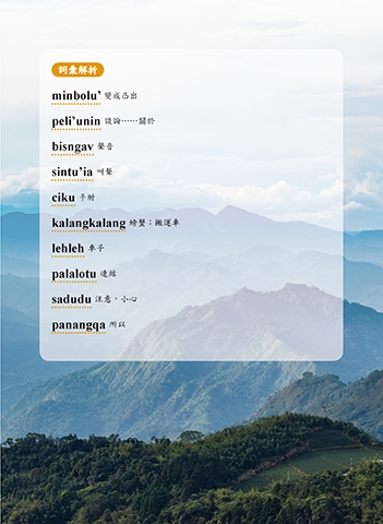 詞彙解析 minbolu’ 變成凸出 peli’unin 談論……關於 bisngav 聲音 sintu’ia 叫聲 ciku 手肘 kalangkalang 螃蟹;搬運車 lehleh 車子 palalotu 連結 sadudu 注意,小心 panangqa 所以 139