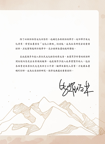除了以族語保存文化內容外,也補充各族族語的單字、延伸單字及文 化背景,希望本書具有「文化小辭典」的功能,成為未來研究者的重要 材料,並能實際應用於教學中,充分發揮本書的使用價值。 在此感謝多年投入原住民文化保存的原文會,本書眾多珍貴的族語新 聞訪談內容是出自原視的報導,也感謝眾多投入此專書製作的人,包括 各族耆老及原住民文史及語言工作者、翻譯及審校人員等,才能讓本書 順利付梓,成為未來語料研究、教學及典藏的重要材料。