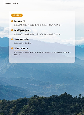 06-Rukai 魯凱族 詞彙解析 1 ta’avalra 是萬山部落過過去對部落勇士們的膽識訓練,是現代的成年禮。 2 molapangolai 是萬山四年一次的重大祭典,其中 ta’avalra 祭典就在同時辦理。 3 asavasavahe 指萬山部落的男性青年。 4 atamatama 是萬山部落比較年邁又有智慧父字輩的一種稱呼,一般面稱的稱呼父親稱: amake。 244