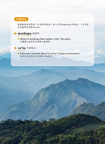 詞彙解析 獵場規範必須尊重,在各氏族獵場,在小米祭 homeyaya 結束後,一定得去 各自獵場祈福豐收 sʉ’tʉ。 1 meehupa 獵場祭 ►ahtuo’te meehupa hote nʉthʉ e’ohʉ ’ola eafou. 全體獵人出發前必須舉行獵場祭。 2 sʉ’tʉ 祈福儀式 ►hola cono tonsoha ahtuo’te sʉ’tʉ ’o hupa ta conoemoo. 每年各氏族要在自獵場做祈福儀式。 259