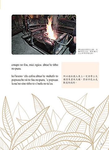 傳說麻雀帶來火種,火 種得來不易,鄒族獵人 上山非常珍惜火源。 cmapo no fou, mici ngicu. ahtuo’te titho no puzu. ko’koeno ‘ela eafou.ahtuo’te mahafo to 所以過去獵人身上一定會帶上火 popsusa ho sii to fuu no puzu, ’e popsuas 種袋來置放火種,其材料是山羌 la na’no sino titho to s’nʉfʉ no ta’cʉ. 獸皮做成的。 261
