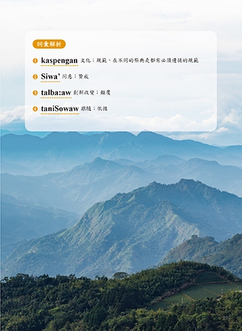 詞彙解析 1 kaspengan 文化;規範,在不同的祭典是都有必須遵循的規範 2 Siwa’ 同意;贊成 3 talba:aw 創新改變;顛覆 4 taniSowaw 跟隨;依循 279