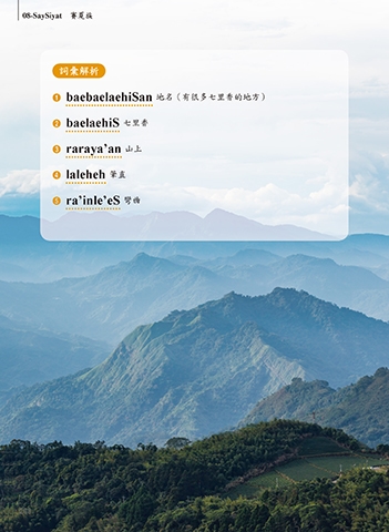 08-SaySiyat 賽夏族 詞彙解析 1 baebaelaehiSan 地名(有很多七里香的地方) 2 baelaehiS 七里香 3 raraya’an 山上 4 laleheh 筆直 5 ra’inle’eS 彎曲 288