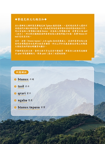 另外,岩壁(btunux tnpusu)上的 ngahu 指的是懸崖上。眉溪部落耆老為大家