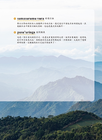 5 sumasʉrʉmʉ vʉra 咀嚼米粒 舉行河祭的時候族人會攜帶少許的米粒,儀式進行中會把米粒咀嚼起來,然 後撒往水中餵食河裡的魚蝦。這也是儀式性的動作。 6 pusu’uringa 夜間捕魚 這是一個古老的捕魚方式,在還沒有電器照明之前,夜間若要捕魚,使用乾 的芒草莖做為火把,魚蝦看到亮光就會聚集起來,方便撈捕。之後有了電燈 照明設備,這種捕魚的方式就不再使用了。 445