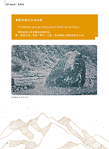 02-Atayal 泰雅族 ◆辭語補充加油站◆ 「Pinsbakan qani ga pinqzyuwan hinbk’an na Tayal」 「傳說的裂石是泰雅族的發祥地」 「破開之地」喻為「孵化」之意,是泰雅族人傳說的創生之地。 ▲ Pinsbkan 裂石創生說。 66