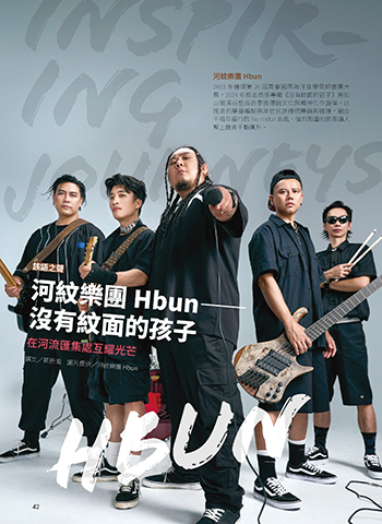 河紋樂團 Hbun 2023 年獲頒第 20 屆貢寮國際海洋音樂祭評審團大 獎,2024 年推出首張專輯《沒有紋面的孩子》將如 山間溪谷悠長的泰雅傳統文化與精神化作旋律,以 搖滾的樂器編制與原住民族傳統樂器的碰撞,融合 千禧年盛行的 Nu metal 曲風,強烈的重拍節奏讓人 腎上腺素不斷飆升。 族語之聲 河紋樂團 Hbun—— 沒有紋面的孩子 在河流匯集處互耀光芒 撰文/蔡舒湉 圖片提供/河紋樂團 Hbun 42 ɨʹ ૄႧʘᑊ JOEE ɨʹ ૄႧʘᑊ JOEE