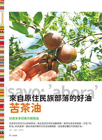 部落好味道 賽夏語:苦茶油 sayo: ’ abora’ 來自原住民族部落的好油 苦茶油 好處多多的東方橄欖油 油茶茶籽因為可以採收榨油,過去曾是造林的鼓勵樹種,食用油食安風暴後,也使「吃 好油」蔚為風潮,讓原本被忽略的苦茶油華麗轉身,成為備受矚目的高級好油。 撰文、攝影|林瑞珠 50 | 'al'alak ɨʹ @ໝλբ༸ JOEE ɨʹ @ໝλբ༸ JOEE