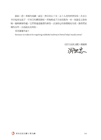 歸結一語,本輯的成績,就是一書百頁五十文。五十人次的書書寫寫,大文小 章合起來也過了一百來回的翻閱篇幅,然後匯成了目光焦點的一本。無論是主動來 稿,編輯團隊特邀,它們都通過嚴謹的審查,以及細心的修潤補充而成。讀者們宣 稱的水準,大抵就由此判准。 再次謝謝大家! fanocuan no maku to ko mapolong malekaka! muhway ta’ kwara’ balay! masalu aravac! 《原住民族文獻》總編輯 原 住 民 族 文 獻 | 第 九 輯 (10)